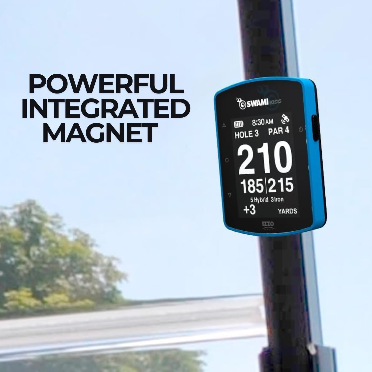 Introducing the Swami KISS 2.0 Handheld Golf GPS Rangefinder, the ultimate companion for every golf enthusiast. This sleek and stylish device comes in a vibrant blue color and is equipped with integrated magnets for convenient attachment to your golf cart or any metal surface.